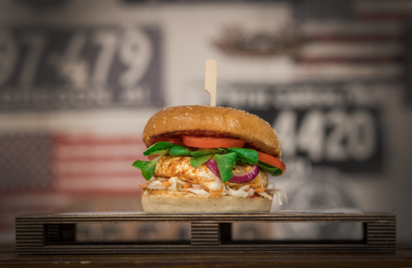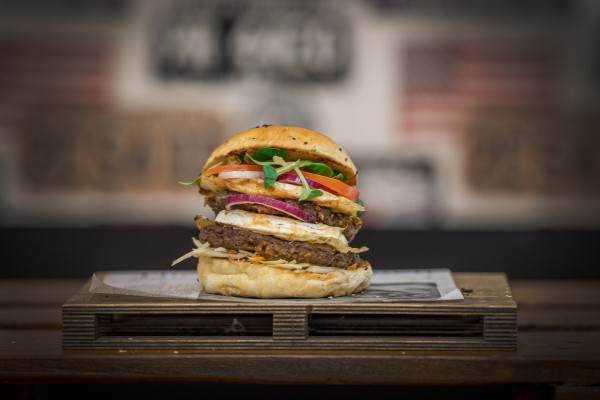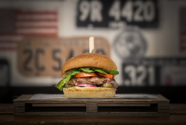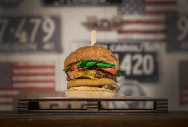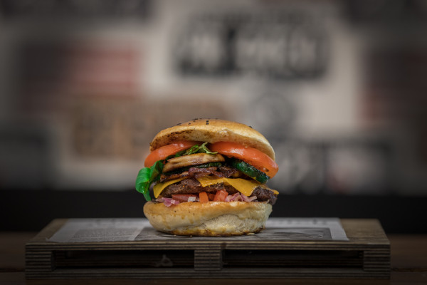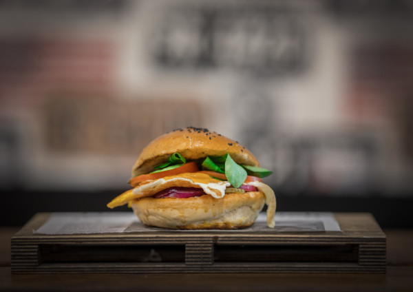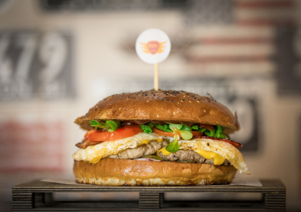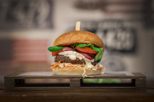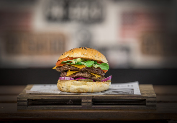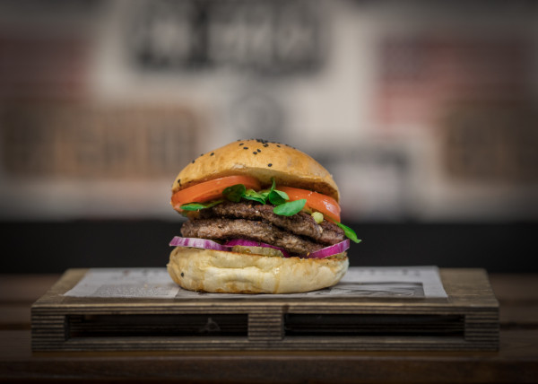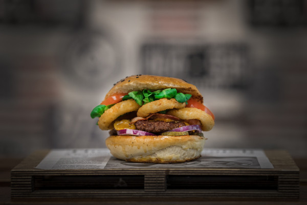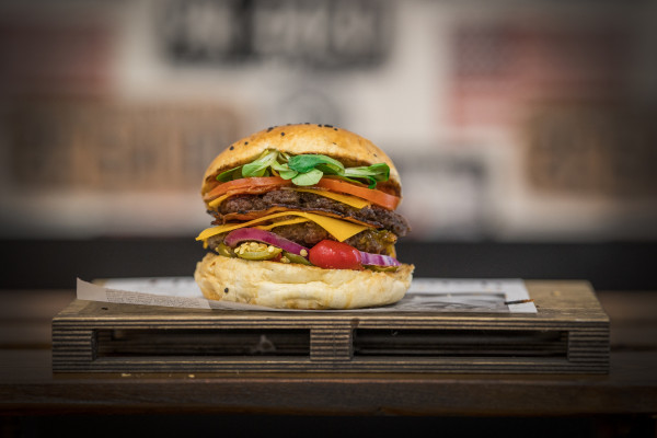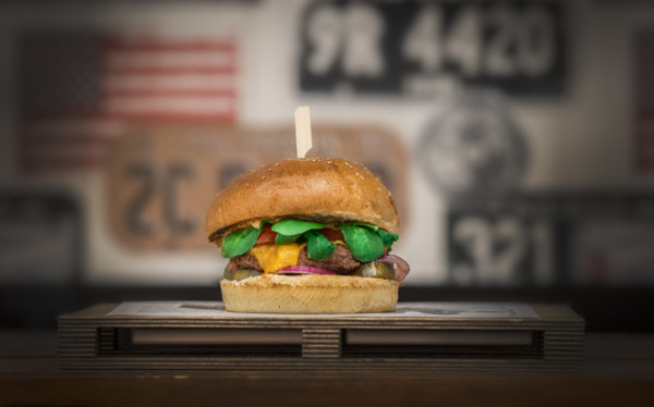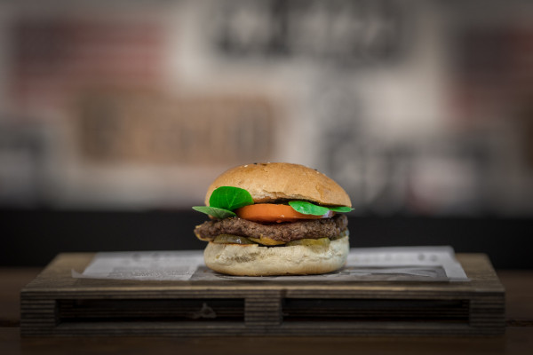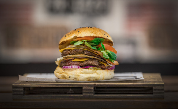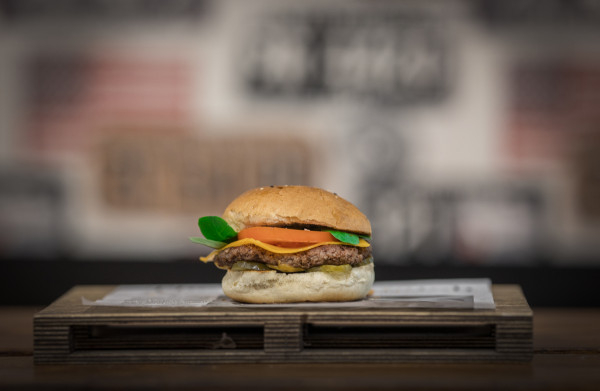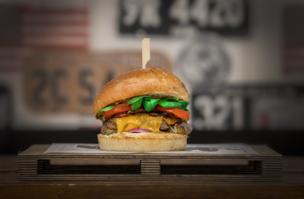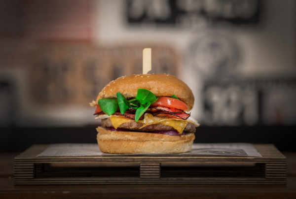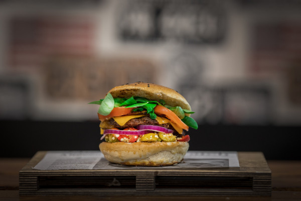 pidi houska, hovězí maso (50 g), sýr cheddar, polníček, rajče, dresing Bourgy burger