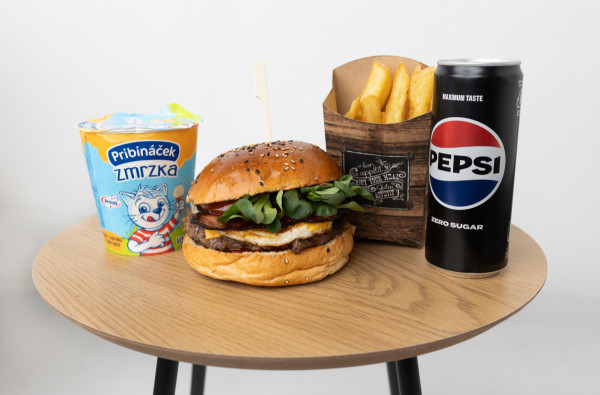 Rychnovák standard menu (Rychnovák standard burger + příloha (hranolky/americké brambory/krokety) + dresing + pití plech 330 ml + zmrzlina Pegas 460 ml