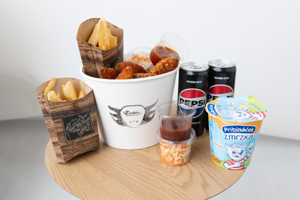 VHODNÉ PRO 2 OSOBY. Kyblík stripsů 1kg + 2x příloha (hranolky/americké brambory/krokety) + 2x dresing + 2x zelný salátek + 2x pití plech 330 ml + 1x zmrzlina Pegas 460 ml